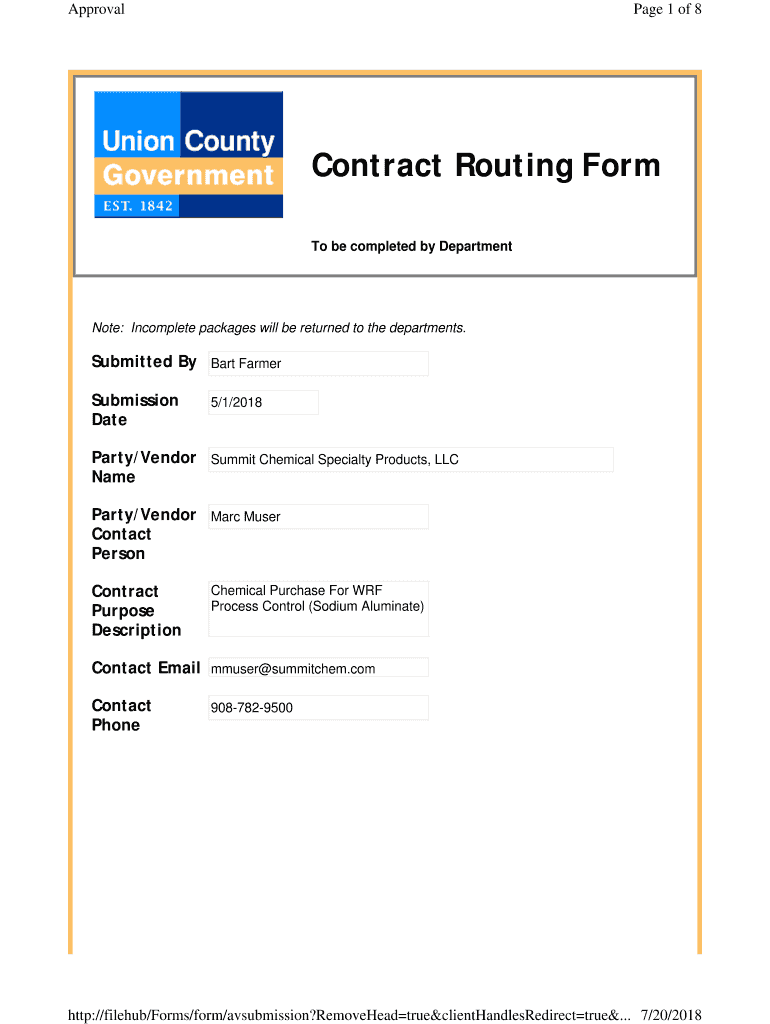 Approval Page 1 of 8Contract Routing Form To be completed by DepartmentNote: Incomplete packages will be returned to the departments. Submitted By Bart FarmerSubmission Date5/1/2018Party/Vendor NameSummit