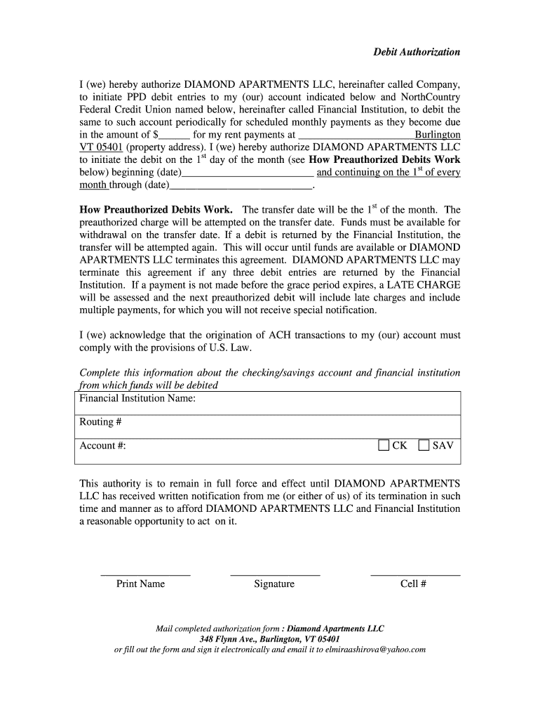 Debit Authorization I (we) hereby authorize DIAMOND APARTMENTS LLC, hereinafter called Company, to initiate PPD debit entries to my (our) account indicated below and NorthCountry Federal Credit Union