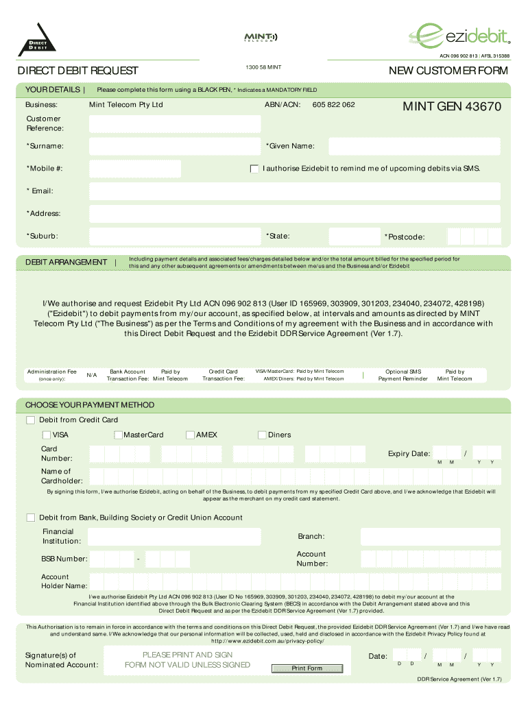 ACN 096 902 813 ADSL 315388DIRECT DEBIT REQUEST YOUR DETAILS NEW CUSTOMER FORM1300 58 Displease complete this form using a BLACK PEN, * Indicates a MANDATORY FIELDBusiness:Mint Telecom Pty Ltd ABN/ACN:MINT