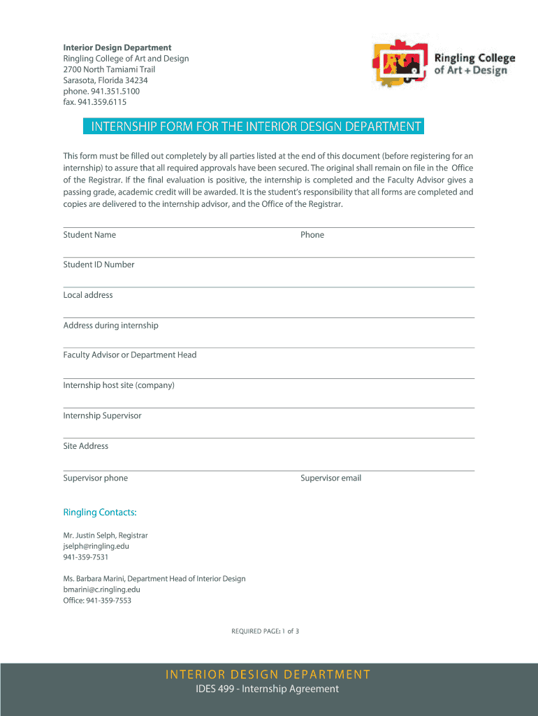 IDES 499Interior Design Internship Course Guidelines & Form Ringling College of Art and Design 2700 North Tamiami Trail Sarasota, FL 34234 www.Ringling.eduINTERIOR DESIGN DEPARTMENTINTERNSHIP GUIDELINES