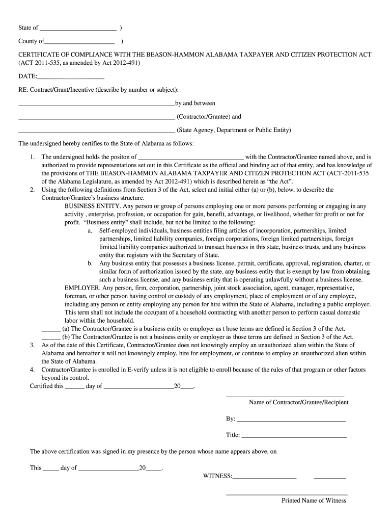 State of) County of)CERTIFICATE OF COMPLIANCE WITH THE BEASONHAMMON ALABAMA TAXPAYER AND CITIZEN PROTECTION ACT (ACT 2011535, as amended by Act 2012491) DATE: RE: Contract/Grant/Incentive (describe