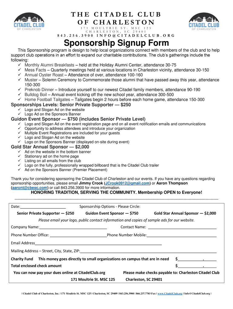T H E C I TA D E L C L U B OF CHARLESTON 1 7 1 M O U L T R I E S T. M S C 1 2 5 C H A R L E S T O N, S C 2 9 4 0 1843.256.3900 INFO CI TADELCLUB. Sponsorship Sign up Form This Sponsorship program