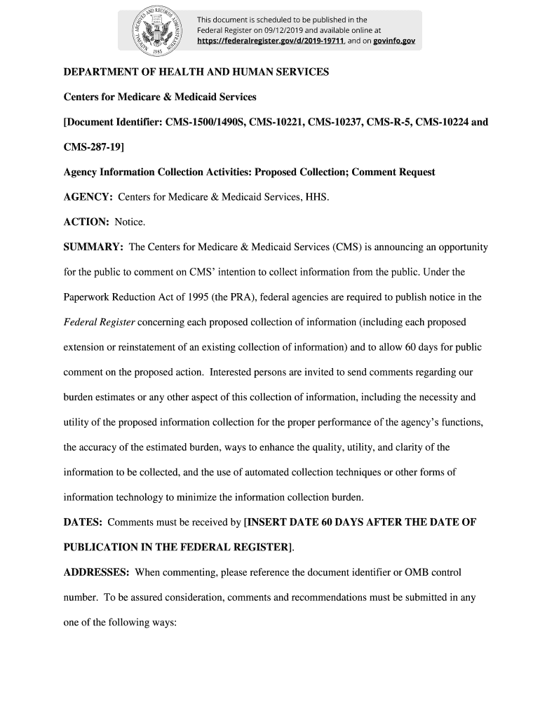 This document is scheduled to be published in the Federal Register on 09/12/2019 and available online at https://federalregister.gov/d/201919711, and on gov info. Department OF HEALTH AND HUMAN SERVICES