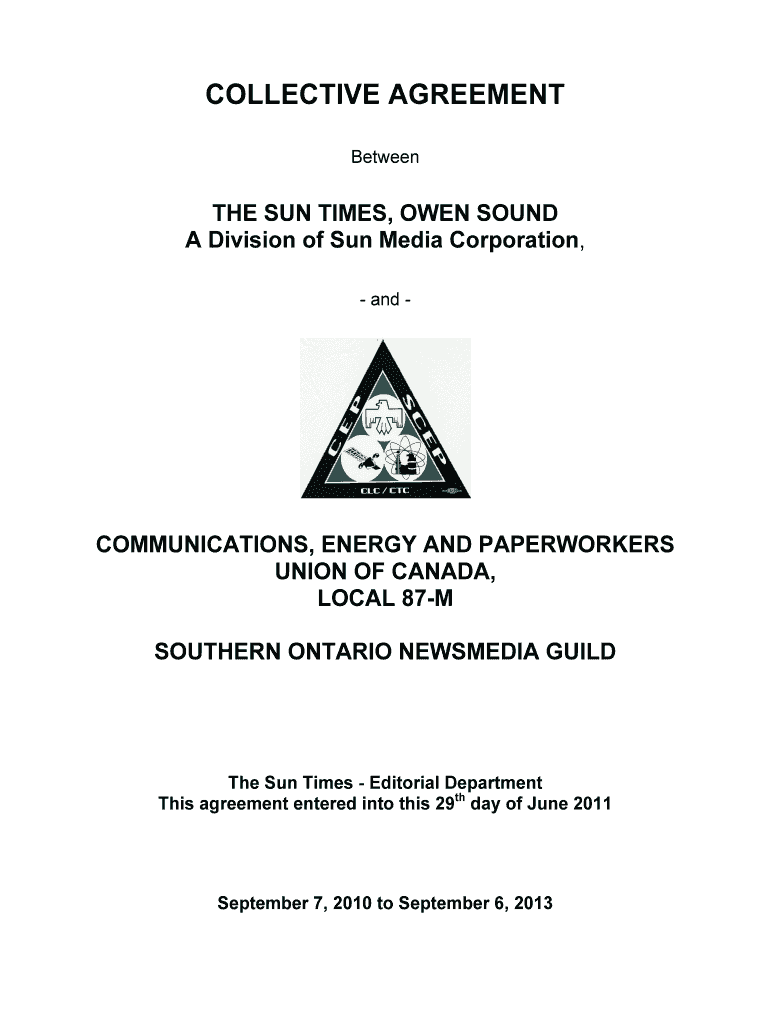 COLLECTIVE AGREEMENT Between SUN TIMES, OWEN SOUND A Division of Sun Media Corporation, and COMMUNICATIONS, ENERGY AND PAPERWORK ERS UNION OF CANADA, LOCAL 87M SOUTHERN ONTARIO NEWSMEN Guide Sun Times