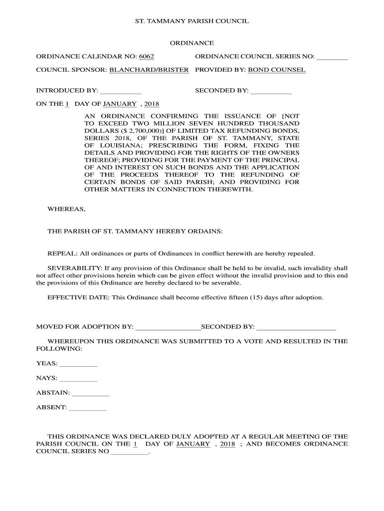 ST. TAMMANY PARISH COUNCILORDINANCE ORDINANCE CALENDAR NO: 6062ORDINANCE COUNCIL SERIES NO:COUNCIL SPONSOR: BLANCHARD/BLISTER PROVIDED BY: BOND COUNSELINTRODUCED BY:SECONDED BY:ON THE 1-DAY OF JANUARY