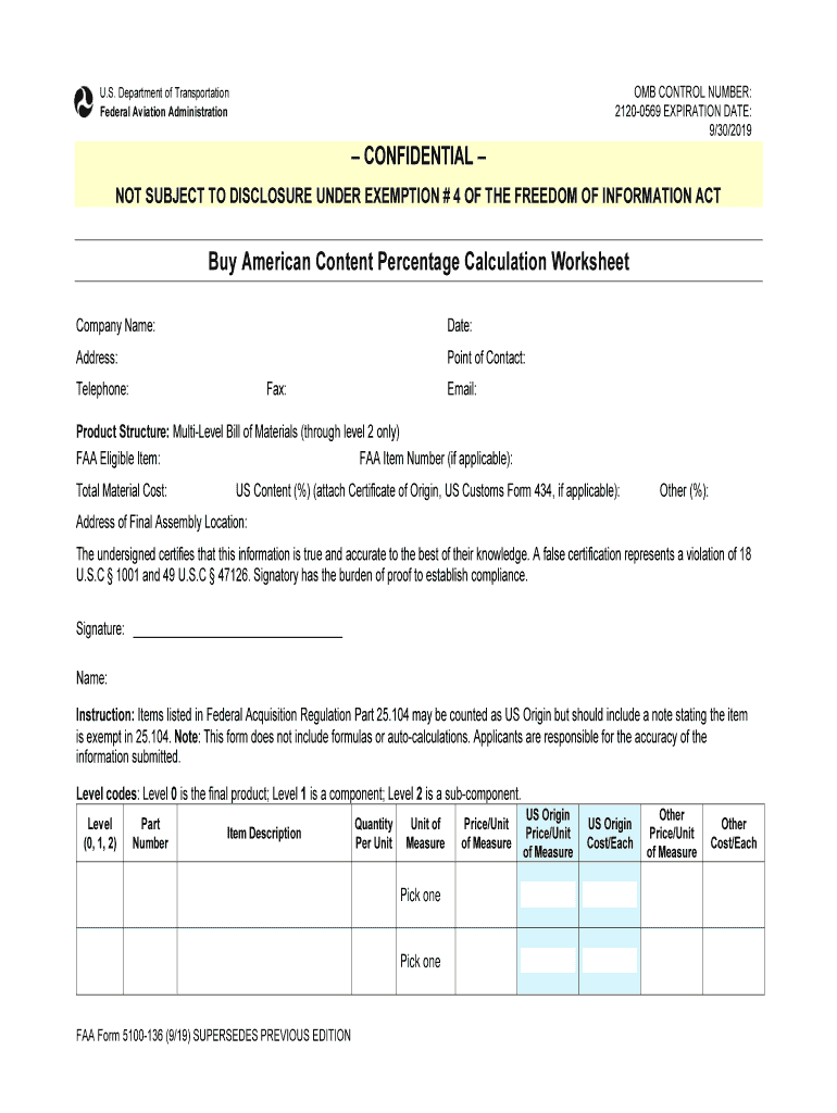 Administration FAA Form 5100136, Buy American Content Percentage Calculation