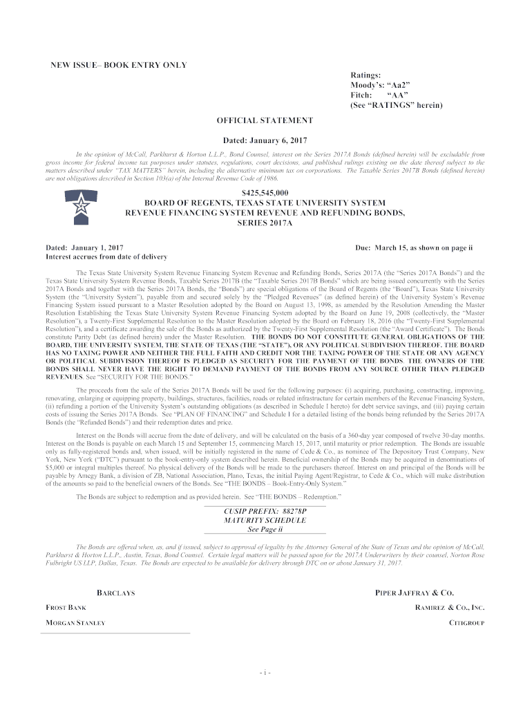 NEW ISSUE BOOK ENTRY ONLY Ratings: Moody's: Aa2 Fitch: AA (See RATINGS herein) OFFICIAL STATEMENT Dated: January 6, 2017, In the opinion of McCall, Pankhurst & Horton L.L.P., Bond Counsel, interest