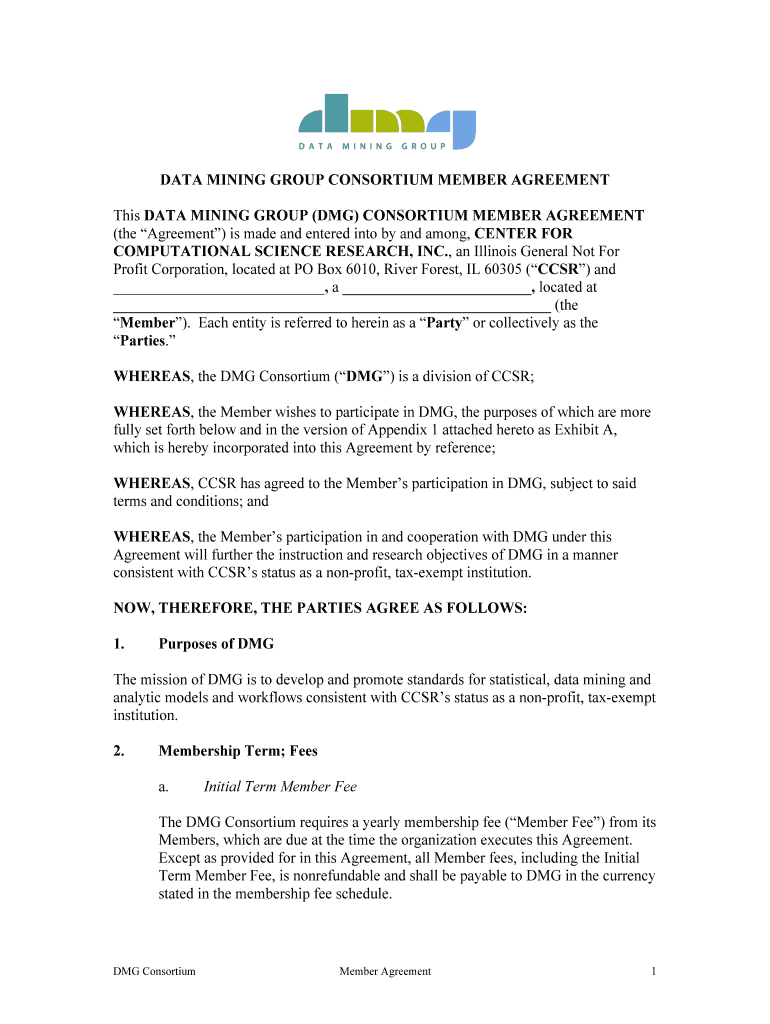 DATA MINING GROUP CONSORTIUM MEMBER AGREEMENT This DATA MINING GROUP (DMG) CONSORTIUM MEMBER AGREEMENT (the Agreement) is made and entered into by and among, CENTER FOR COMPUTATIONAL SCIENCE RESEARCH,