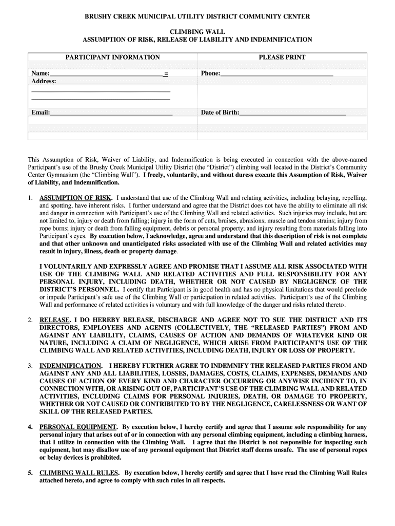 BRUSH CREEK MUNICIPAL UTILITY DISTRICT COMMUNITY CENTER CLIMBING WALL ASSUMPTION OF RISK, RELEASE OF LIABILITY AND INDEMNIFICATION PARTICIPANT INFORMATIONPLEASE Printable: Address: Phone: Email: Date