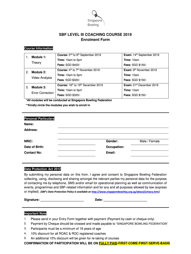 Get the free 2019 SBF Level 3 Form - Singapore Bowling Federation - singaporebowling org