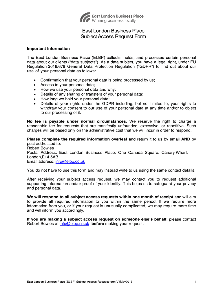 East London Business Place Subject Access Request Form Important Information The East London Business Place (ELBE) collects, holds, and processes certain personal data about our clients (data subjects).