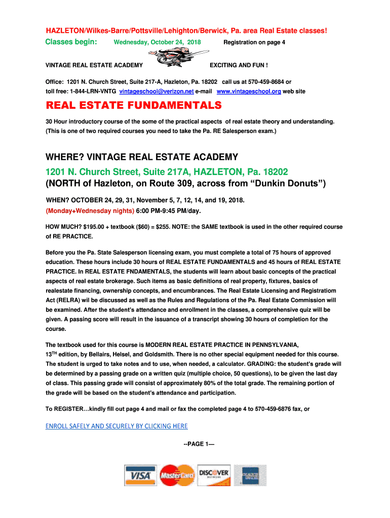 HAZLETON/WilkesBarre/Pottsville/Leighton/Berwick, Pa. area Real Estate classes! Classes begin:Wednesday, October 24, 2018VINTAGE REAL ESTATE ACADEMYRegistration on page 4EXCITING AND FUN ! Office: