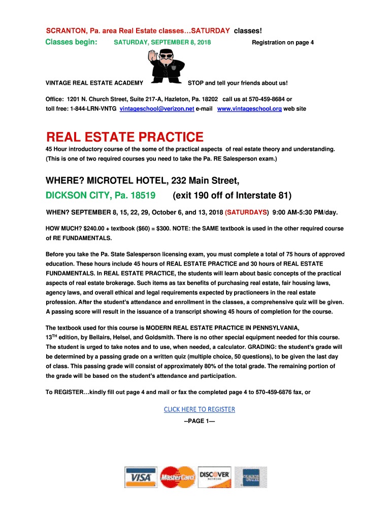 SCRANTON, Pa. area Real Estate classesSATURDAY classes! Classes begin:SATURDAY, SEPTEMBER 8, 2018VINTAGE REAL ESTATE ACADEMYRegistration on page 4STOP and tell your friends about us! Office: 1201
