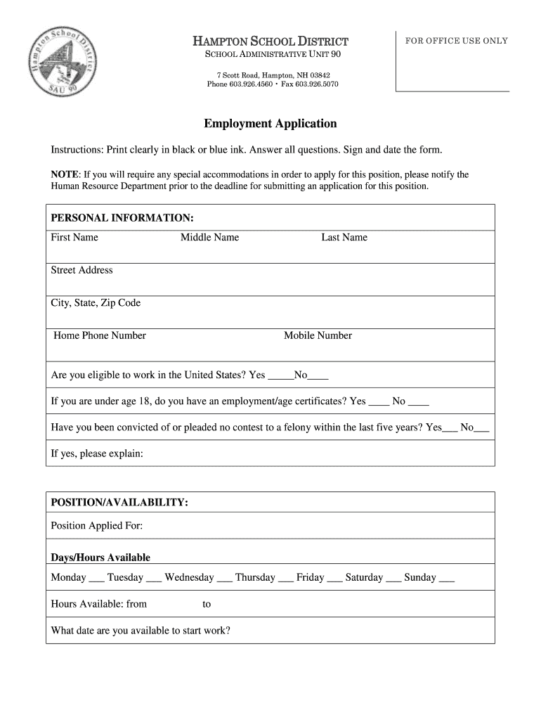 HAMPTON SCHOOL DISTRACTOR OFFICE USE PLAYSCHOOL ADMINISTRATIVE UNIT 90 7 Scott Road, Hampton, NH 03842 Phone 603.926.4560 Fax 603.926.5070Employment Application Instructions: Print clearly in black