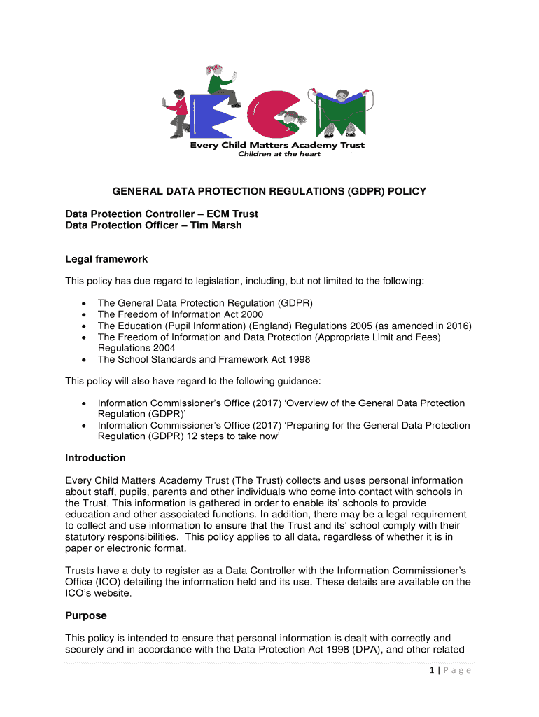 GENERAL DATA PROTECTION REGULATIONS (GDPR) POLICY Data Protection Controller ECM Trust Data Protection Officer Tim Marshal framework This policy has due regard to legislation, including, but not limited