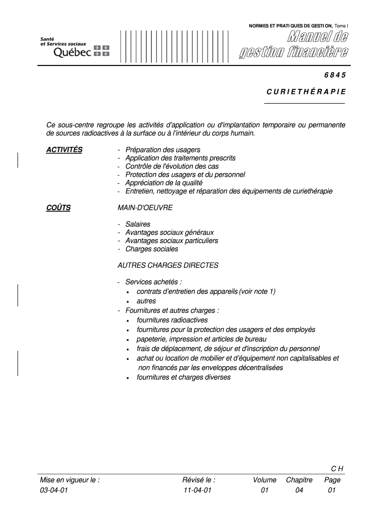 NORMS ET CRITIQUES DE SECTION, Tome I6845 CURIETHRAPIE Ce souscentre regrouped LES activity application of d 'implantation temporary of permanent DE sources radioactive la surface of lintier Du corps