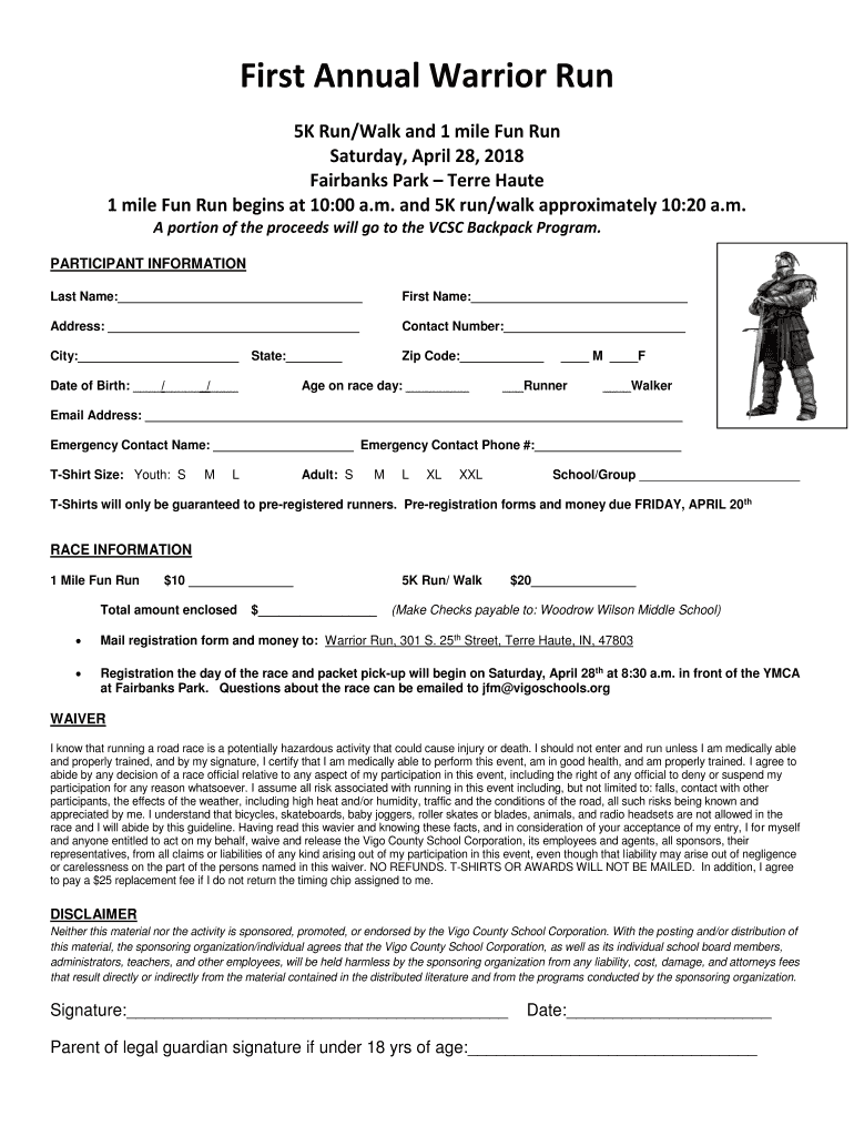 First Annual Warrior Run 5K Run/Walk and 1 mile Fun Run Saturday, April 28, 2018, Fairbanks Park Terre Haute 1 mile Fun Run begins at 10:00 a.m. and 5K run/walk approximately 10:20 a.m. A portion