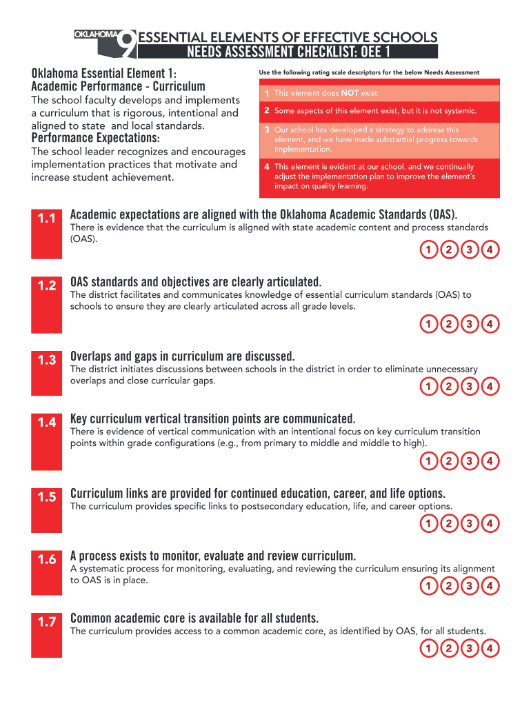 OKLAHOMAESSENTIAL ELEMENTS OF EFFECTIVE SCHOOLSNEEDS ASSESSMENT CHECKLIST: ONE 1Oklahoma Essential Element 1: Academic Performance Curriculum school faculty develops and implements a curriculum that