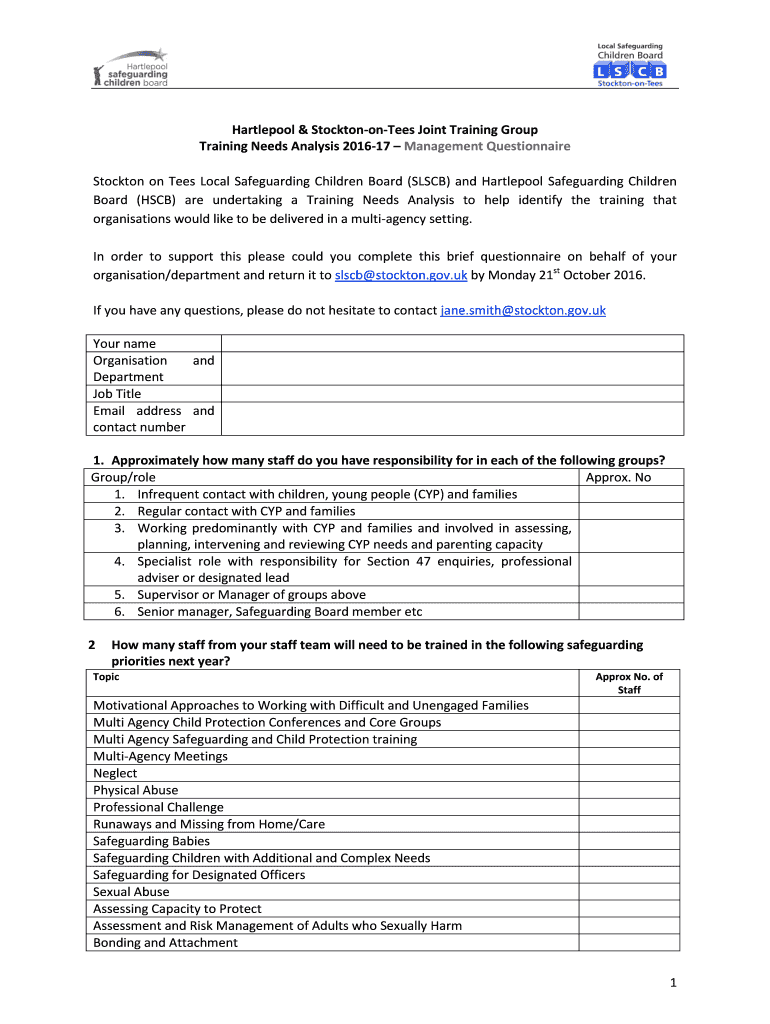 Hartlepool & StocktononTees Joint Training Group Training Needs Analysis 201617 Management Questionnaire Stockton-on-Tees Local Safeguarding Children Board (SL SCB) and Hartlepool Safeguarding Children