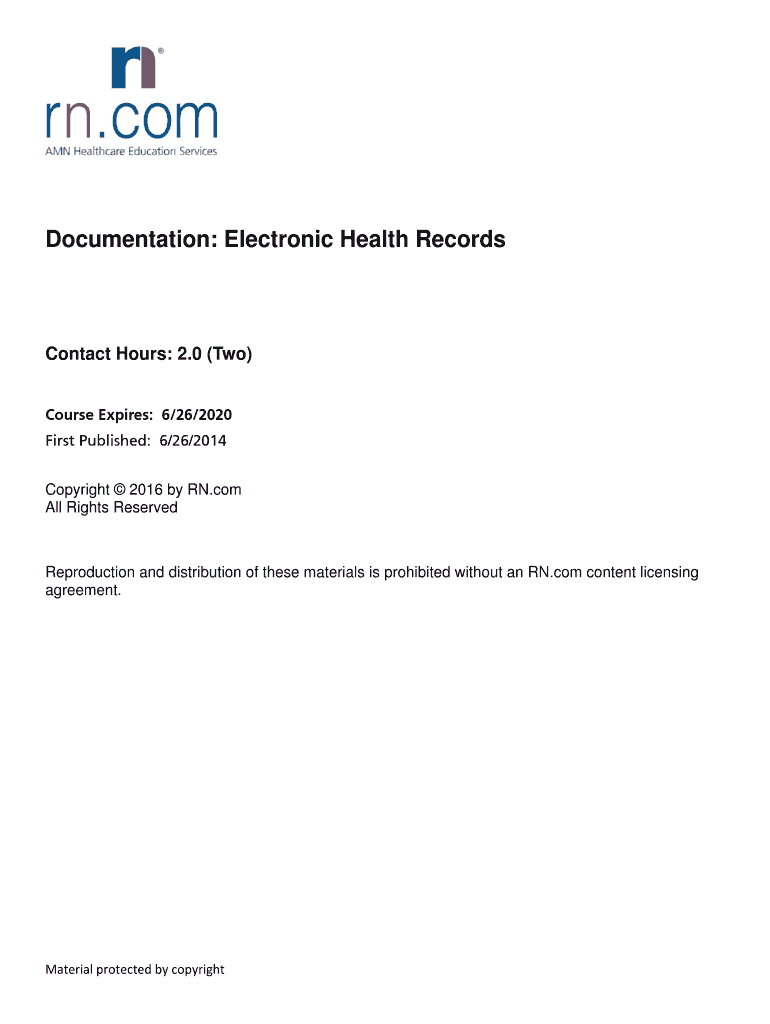 Documentation: Electronic Health RecordsContact Hours: 2.0 (Two) Course Expires: 6/26/2020 First Published: 6/26/2014 Copyright 2016 by RN.com All Rights ReservedReproduction and distribution of these