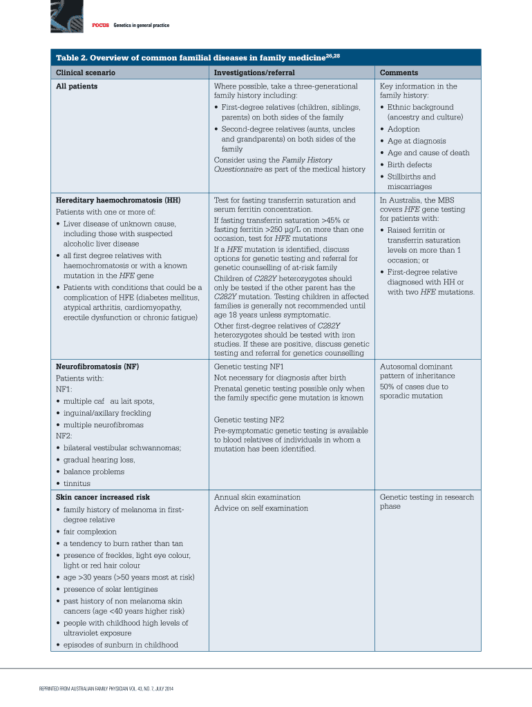 FOCUS Genetics in general practicable 2. Overview of common familial diseases in family medicine26,28