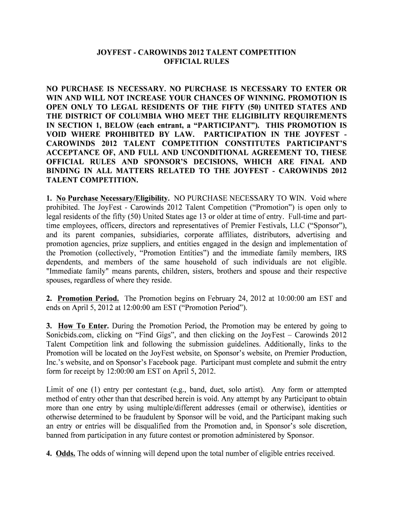 JOYLESS CAROTIDS 2012 TALENT COMPETITION OFFICIAL RULES NO PURCHASE IS NECESSARY. NO PURCHASE IS NECESSARY TO ENTER OR WIN AND WILL NOT INCREASE YOUR CHANCES OF WINNING. PROMOTION IS OPEN ONLY TO