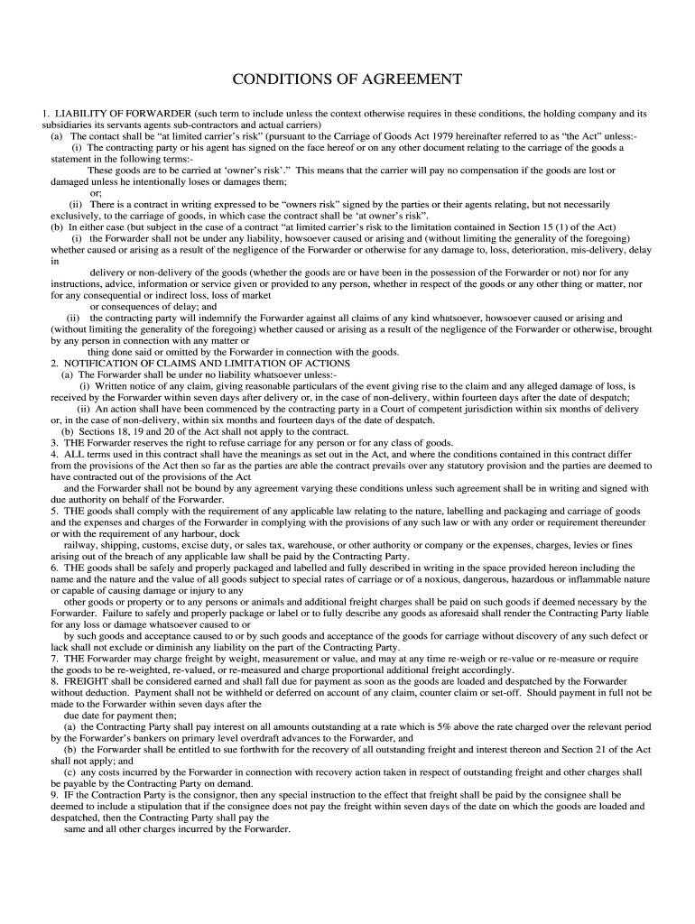 1. LIABILITY OF FORWARDER (such term to include unless the context otherwise requires in these conditions, the holding company and its