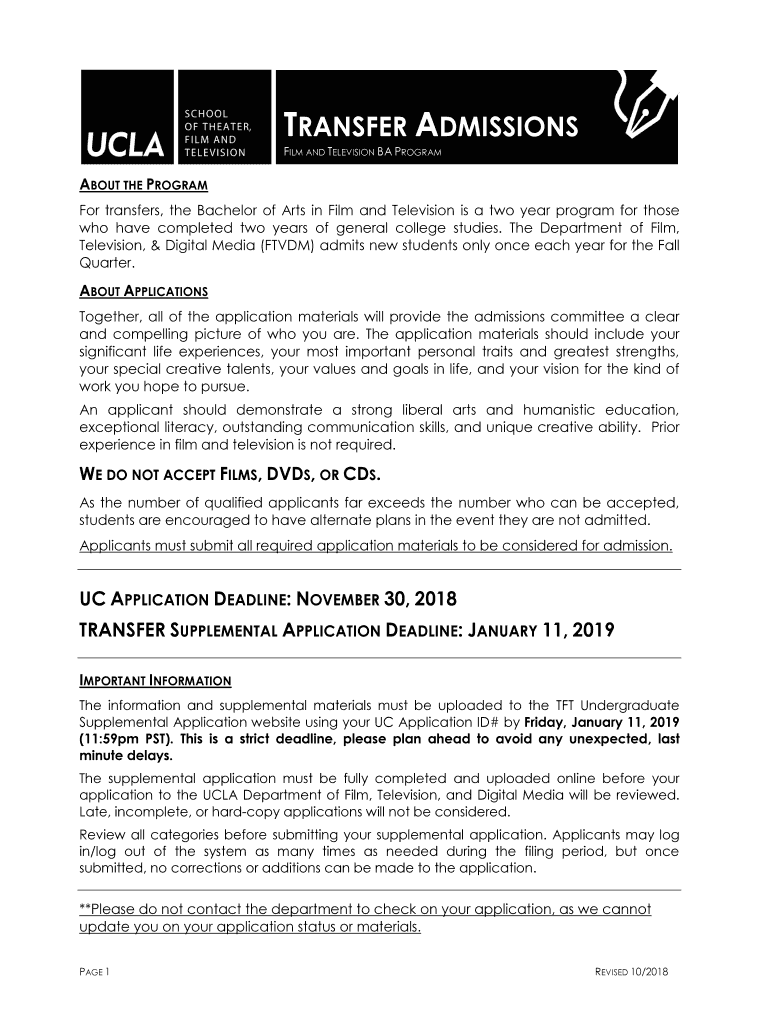 TRANSFER ADMISSIONS FILM AND TELEVISION BA PROGRAMABOUT THE PROGRAM For transfers, the Bachelor of Arts in Film and Television is a two-year program for those who have completed two years of general