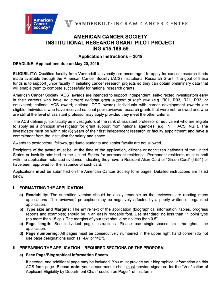 AMERICAN CANCER SOCIETY INSTITUTIONAL RESEARCH GRANT PILOT PROJECT IRG #1516959 Application Instructions 2019 DEADLINE: Applications due on May 20, 2019, ELIGIBILITY: Qualified faculty from Vanderbilt