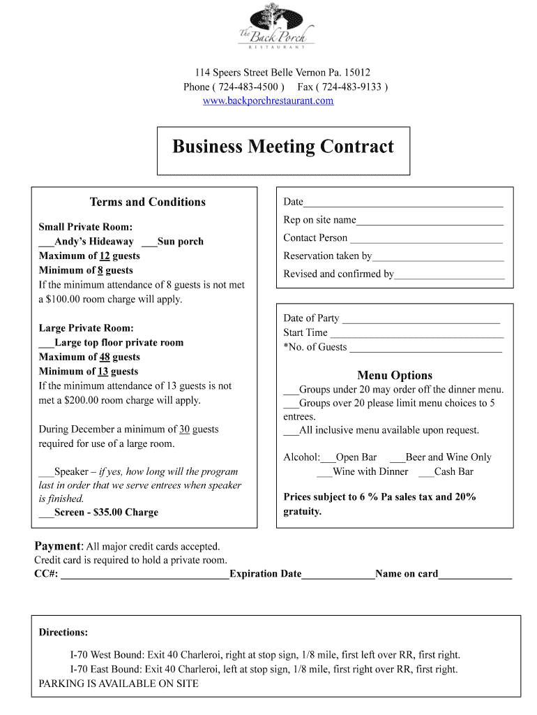 114 Speer's Street Belle Vernon Pa. 15012 Phone (7244834500) Fax (7244839133) www.backporchrestaurant.comBusiness Meeting Contract Terms and Conditions Small Private Room: Andy's Hideaway Sun porch