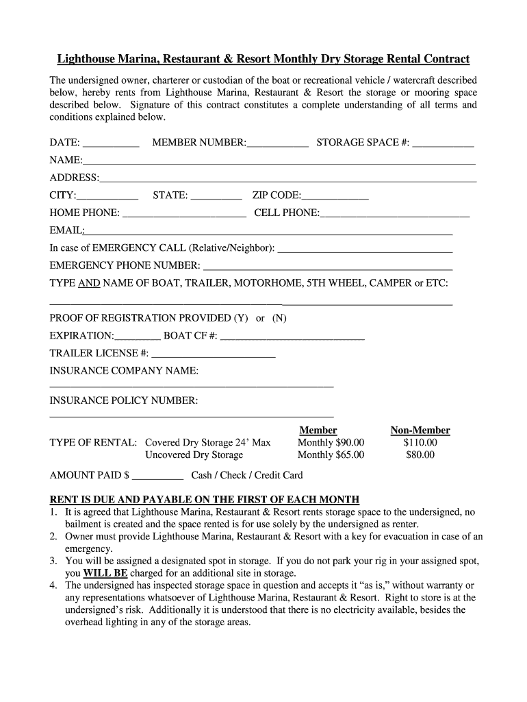 Lighthouse Marina, Restaurant & Resort Monthly Dry Storage Rental Contract The undersigned owner, charterer or custodian of the boat or recreational vehicle / watercraft described below, hereby rents