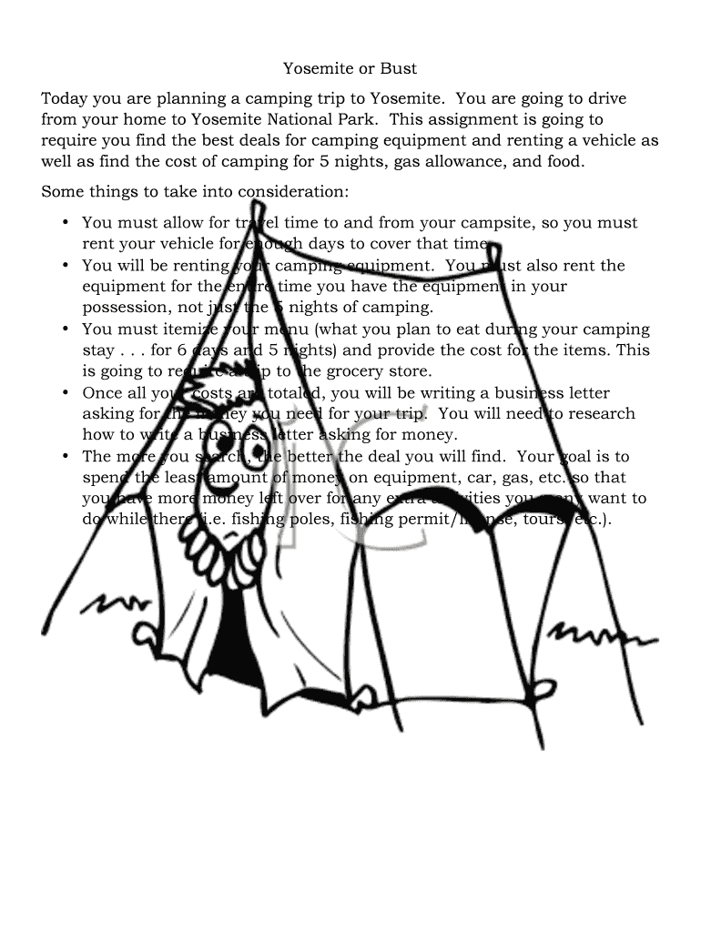 Yosemite or Bust Today you are planning a camping trip to Yosemite. You are going to drive from your home to Yosemite National Park. This assignment is going to require you find the best deals for
