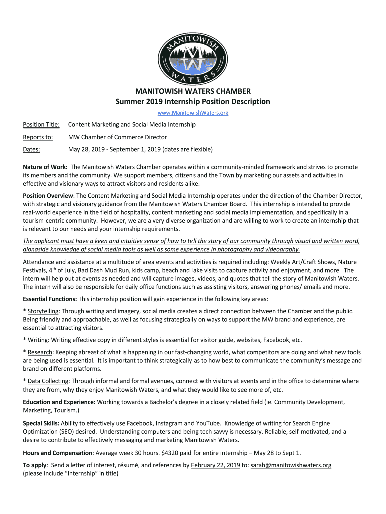 MANITOWOC WATERS CHAMBER Summer 2019 Internship Position Description www.ManitowishWaters.orgPosition Title:Content Marketing and Social Media InternshipReports to:MW Chamber of Commerce Directorates:May