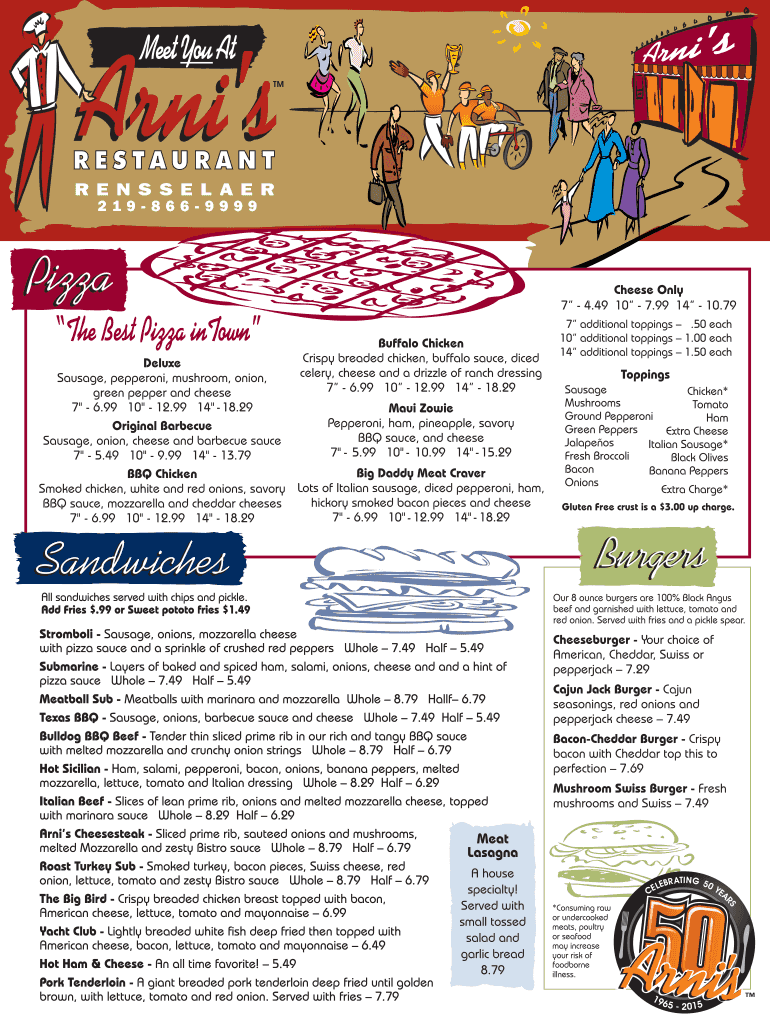 RNIS Meet You AtTMRESTAURANT R E N S S E L A E R 2198669999Pizza The Best Pizza inTownCheese Only 7 4.49 10 7.99 14 10.79 Buffalo Chicken Crispy breaded chicken, buffalo sauce, diced celery, cheese