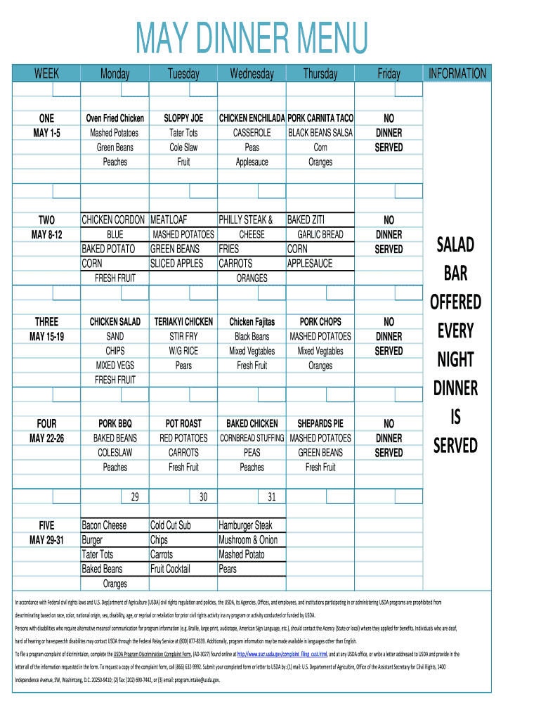 MAY DINNER MENU WEEKMondayTuesdayONE MAY 15Oven Fried Chicken Mashed Potatoes Green Beans PeachesSLOPPY JOE Tater Tots Cole Slaw Fruit MAY 812WednesdayCHICKEN CORDON MEATLOAF BLUEGRASS BEANS SLICED