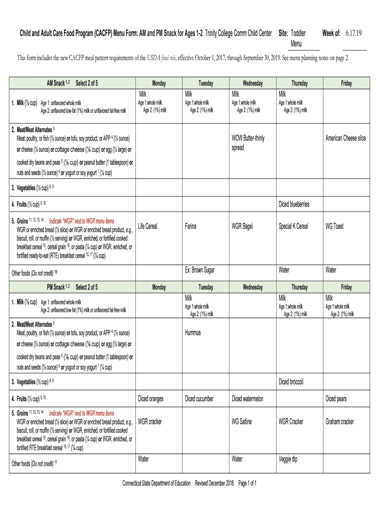 Child and Adult Care Food Program (CA CFP) Menu Form: AM and PM Snack for Ages 12 Trinity College Comm Child Center Site: Toddler
