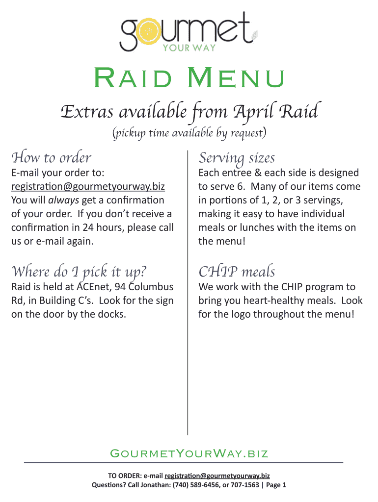 Raid MenuExtras available from April Raid (pickup time available by request)How to preserve somewhere do I pick it up?CHIP mealsEmail your order to: registration gourmetyourway.biz You will always