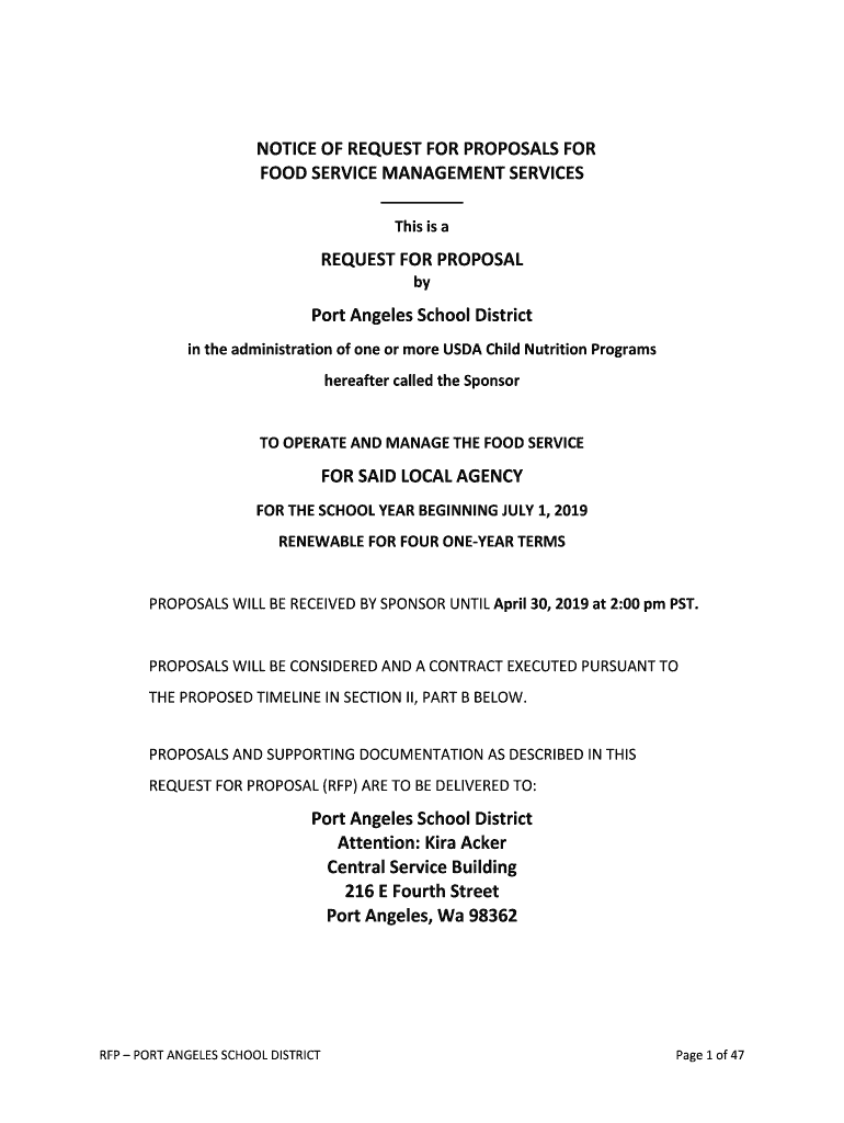 NOTICE OF REQUEST FOR PROPOSALS FOR FOOD SERVICE MANAGEMENT SERVICES This is request FOR PROPOSAL by Port Angeles School District in the administration of one or more USDA Child Nutrition Programs
