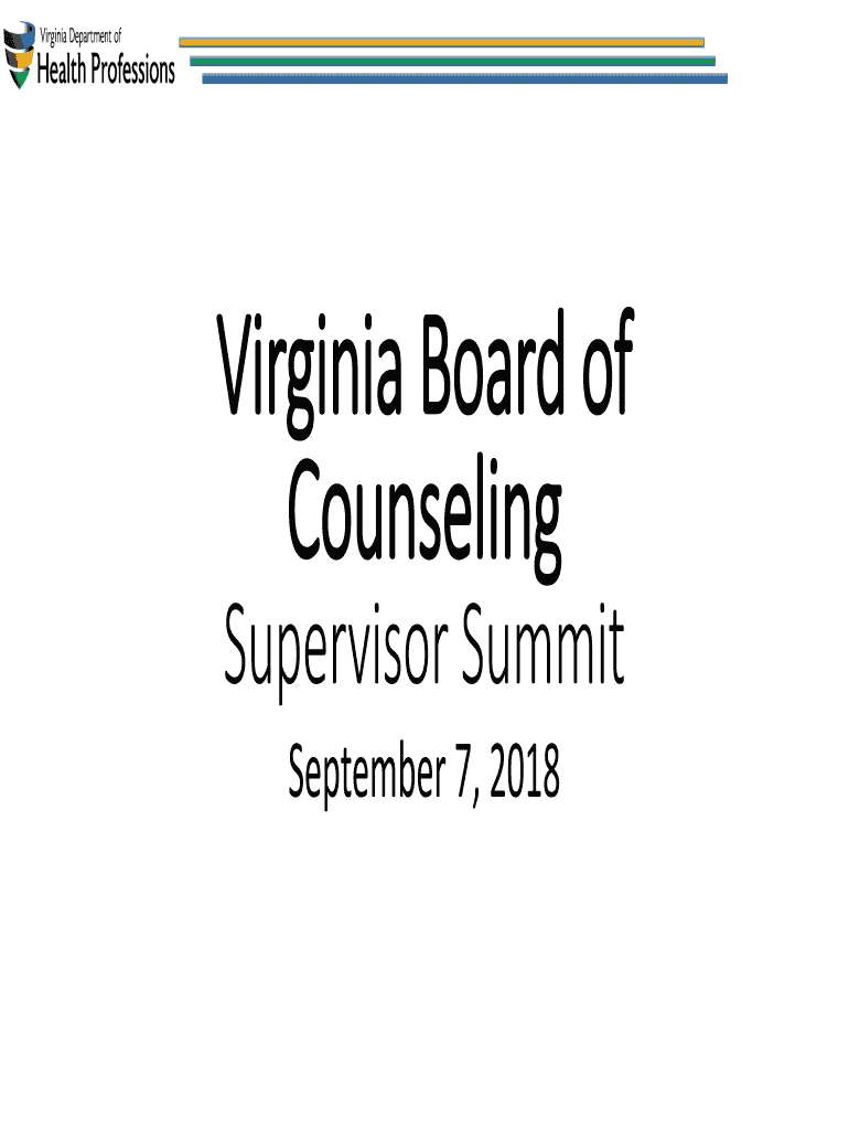 Virginia Board of Counseling Supervisor Summit September 7, 2018Virginia Department of Health Professions (DHP)Our mission is to ensure safe and competent patient care by licensing health professionals,
