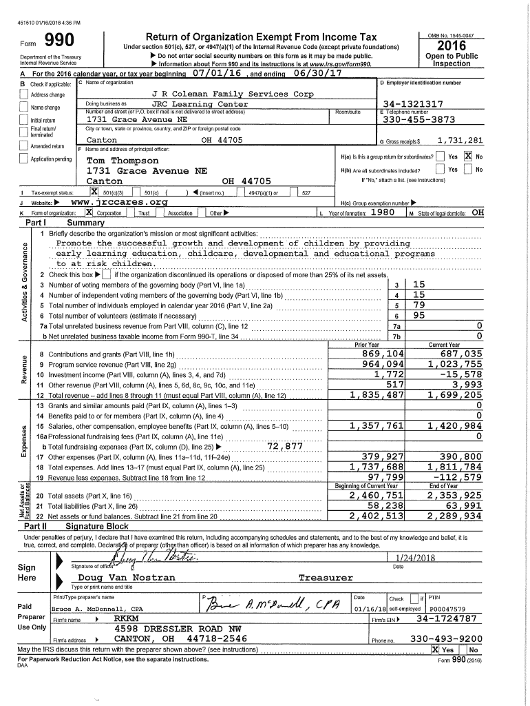 451510 01/24/2018 4:16 Form 990 (2016)Part III 1J R Coleman Family Services Corp341321317Statement of Program Service Accomplishments Check if Schedule O contains a response or note to any line in