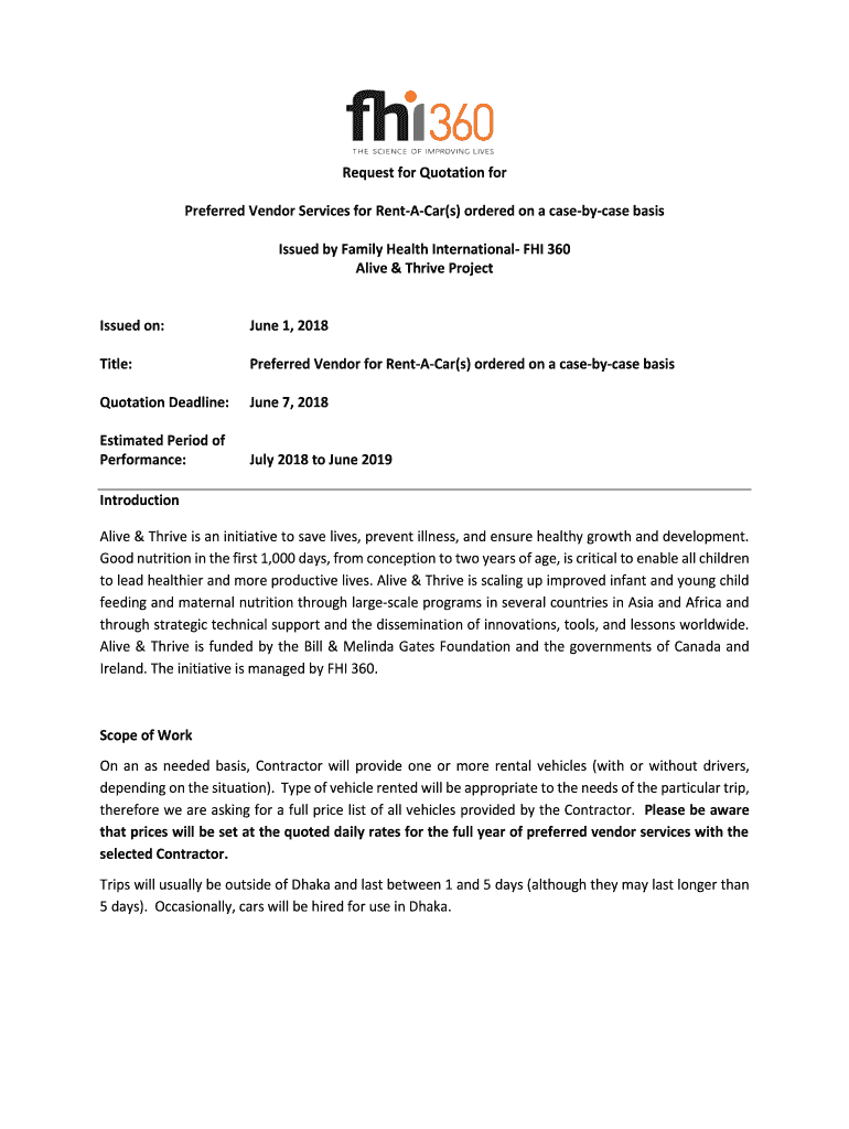 Request for Quotation for Preferred Vendor Services for Rental(s) ordered on a casebycase basis Issued by Family Health International FBI 360 Alive & Thrive ProjectIssued on:June 1, 2018Title:Preferred