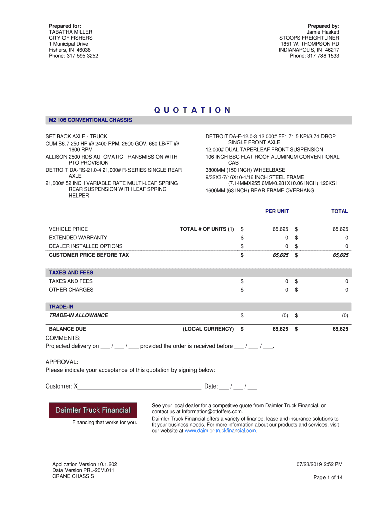 Prepared for: TABATHA MILLER CITY OF FISHERS 1 Municipal Drive Fishers, IN 46038 Phone: 3175953252Prepared by: Jamie Hackett STOOPS FREIGHTLINER 1851 W. THOMPSON RD INDIANAPOLIS, IN 46217 Phone: 3177881533Q