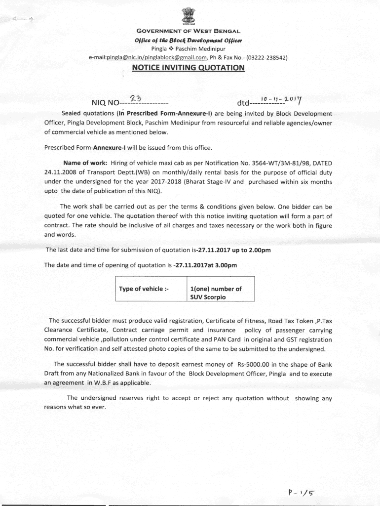 GOVERNMENT OF WEST BENGALOffice of tile 8eociiDavaeopsiamf Officer Ping la Paschal Manipur email:ping la nic.in/pinglablock gmail.com, pH & Fax No. (03222238542)NOTICE INVITING QUOTATION NO23dtdI0