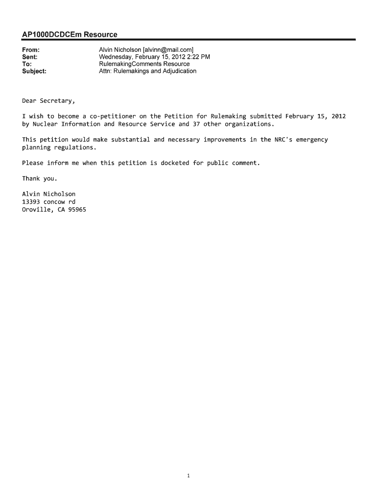 AP1000DCDCEm Resource From: Sent: To: Subject:Alvin Nicholson Alvin mail.com Wednesday, February 15, 2012 2:22 PM RulemakingComments Resource Attn: Rule makings and AdjudicationDear Secretary, I wish