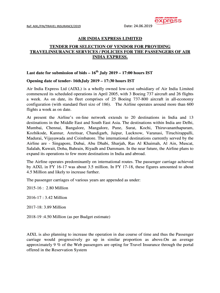 Ref: AIL/FIN/TRAVEL INSURANCE/2019Date: 24.06.2019AIR INDIA EXPRESS LIMITED TENDER FOR SELECTION OF VENDOR FOR PROVIDING TRAVELINSURANCE SERVICES / POLICIES FOR THE PASSENGERS OF AIR INDIA EXPRESS.