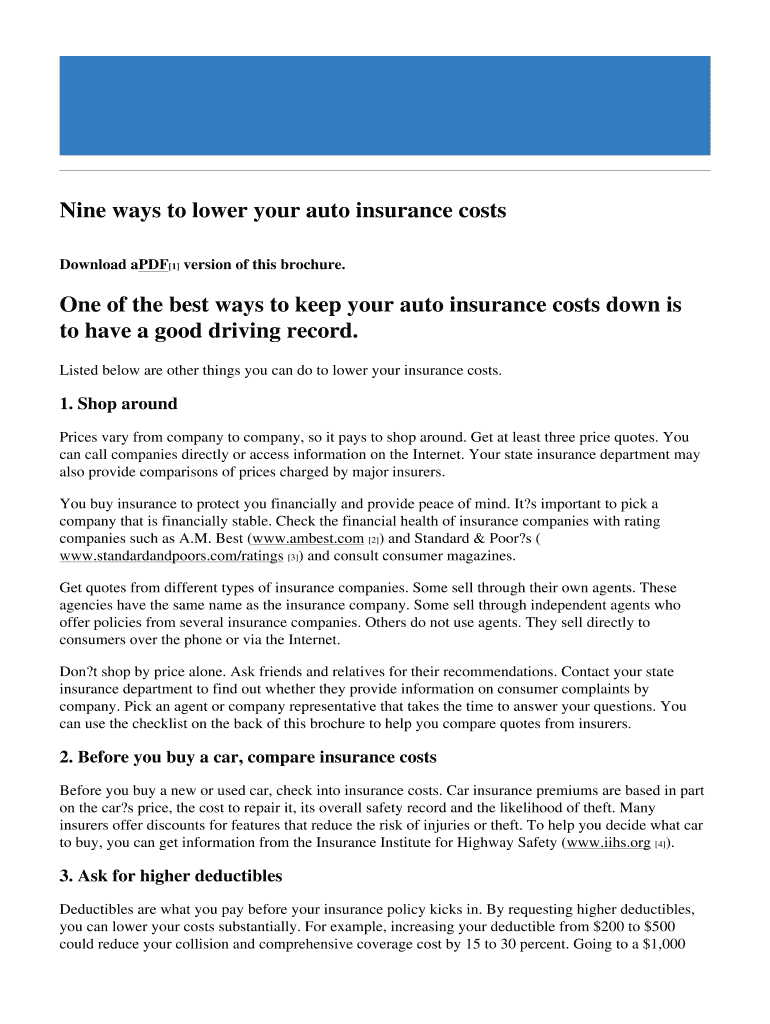 Nine ways to lower your auto insurance costs Download PDF 1 version of this brochure. One of the best ways to keep your auto insurance costs down is to have a good driving record. Listed below are