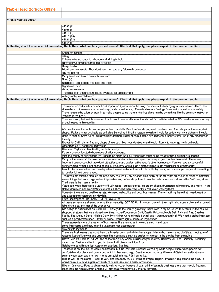 Noble Road Corridor Online What is your zip code? 44095 (1) 44106 (5) 44112 (5) 44118 (25) 44121 (74) 44145 (1) In thinking about the commercial areas along Noble Road, what are their greatest assets?