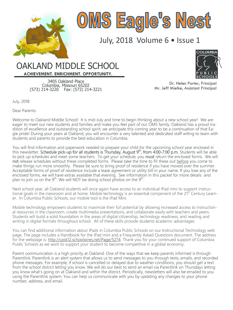 July 2018 Volume 6 Issue 1 OAKLAND MIDDLE SCHOOL ACHIEVEMENT. ENRICHMENT. OPPORTUNITY. 3405 Oakland Place Columbia, Missouri 65202 (573) 2143220 Fax: (573) 2143221Dr. Helen Porter, Principal Mr. Jeff