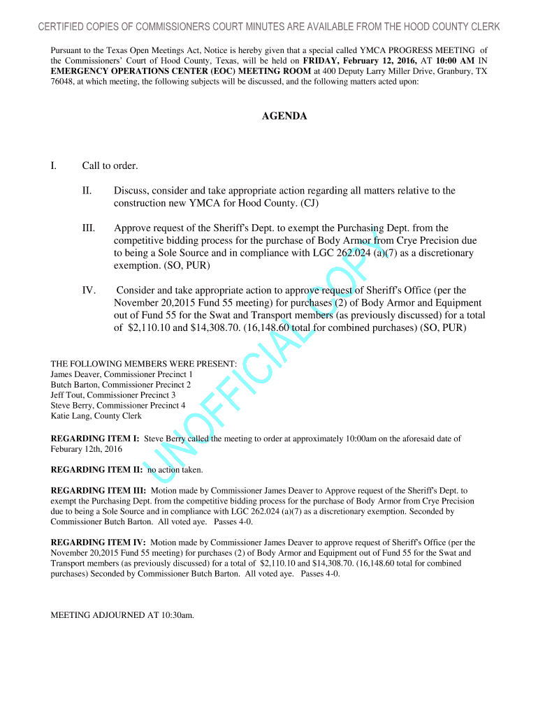CERTIFIED COPIES OF COMMISSIONERS COURT MINUTES ARE AVAILABLE FROM THE HOOD COUNTY CLERK