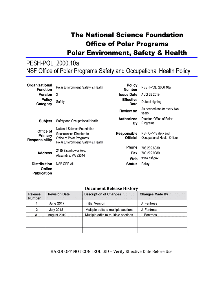 The National Science Foundation Office of Polar Programs Polar Environment, Safety & HealthPESHPOL 2000.10a NSF Office of Polar Programs Safety and Occupational Health Policy Organizational Function